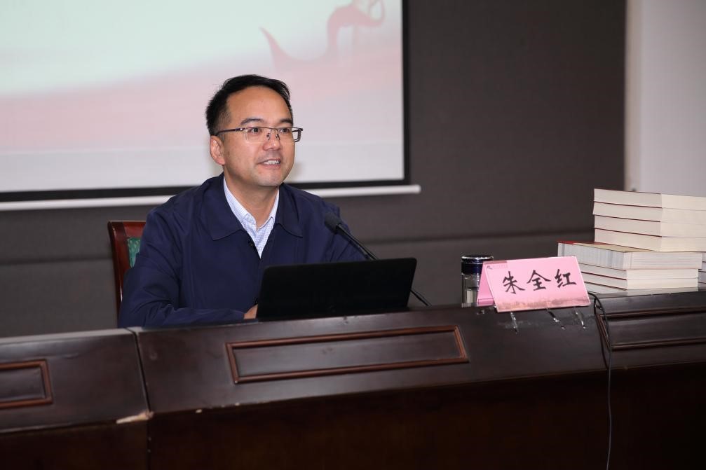 报告会前,举行了绍兴市委党史研究室“红色书架”设立仪式,绍兴市委党史研究室向兰亭书法艺术学院捐赠红色图书。绍兴市委党史研究室主任朱全红为学院“红色书架”授牌,学院党委副书记李湛接受授牌和赠书。