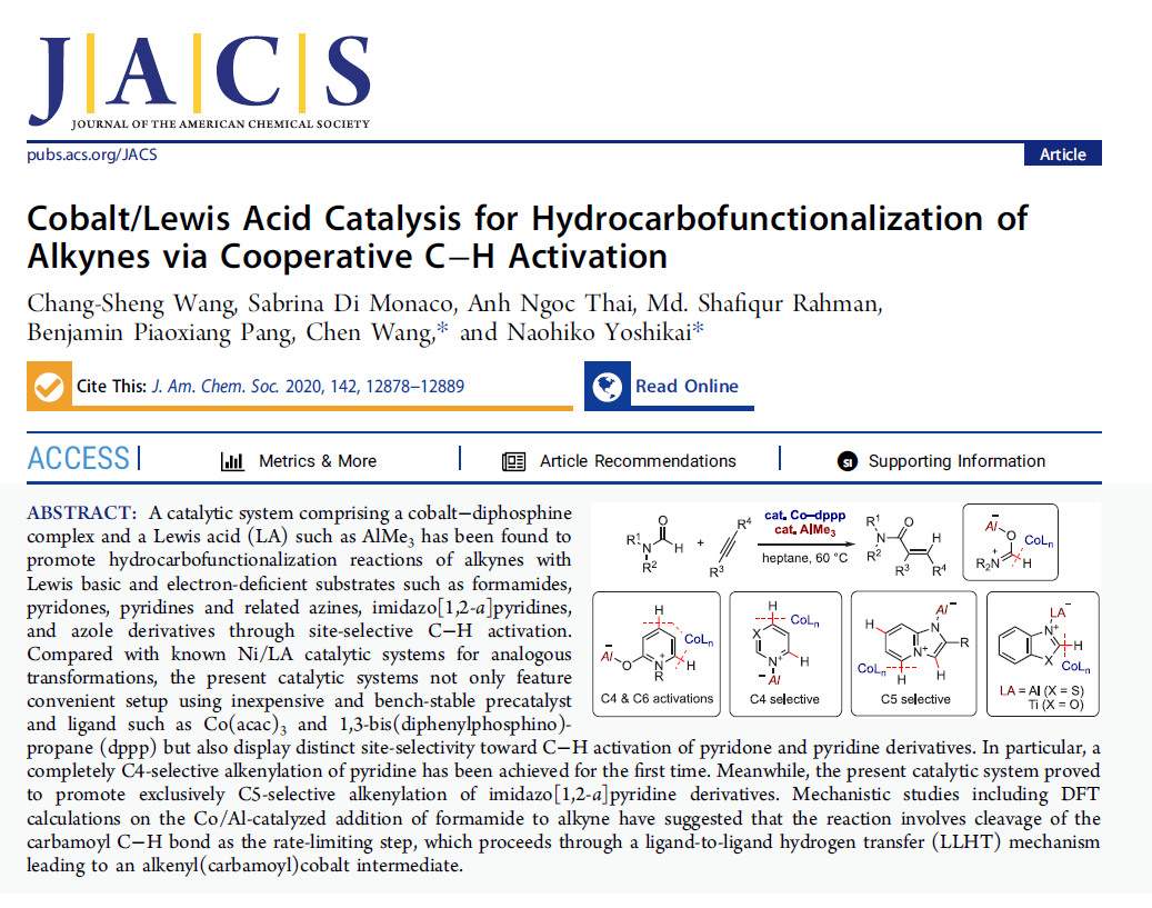 2020年6月,研究团队在Journal of the American Chemical Society杂志上发表了题为《Cobalt/Lewis Acid Catalysis for Hydrocarbofunctionalization of Alkynes via Cooperative C−H Activation》的文章,发展了一种由钴-二膦配合物和路易斯酸(LA,如 AlMe3)组成的催化体系,可以通过实现对路易斯碱性的缺电子底物(如甲酰胺、吡啶酮、吡啶和相关嗪、咪唑 [ 1,2-a] 吡啶和唑衍生物)的位点选择性的C—H 活化,而实现对炔烃的氢羰基功能化。与已知的用于类似转化的 Ni/LA 催化系统相比,该催化体系的特色在于一方面使用了廉价且实验室稳定的预催化剂和配体如 Co(acac)3和1,3-双(二苯基膦)丙烷 (dppp),而且对吡啶酮和吡啶衍生物的C—H活化显示出与Ni催化体系不同的位点选择性。特别是首次实现了吡啶的完全 C4 选择性烯基化。同时,该催化系统还可以选择性的对咪唑并 [1,2-a] 吡啶衍生物实现C5 选择性烯基化。通过DFT计算对 Co/ AlMe3催化的N,N-二甲基甲酰胺对炔烃的加成反应机理研究表明,该反应经历配体到配体氢转移 (ligand-to-ligand hydrogen transfer, LLHT) 生成烯基(氨基甲酰基)钴中间体的历程进行,甲酰胺的羰基 C—H键的裂解是反应的决速步骤。
