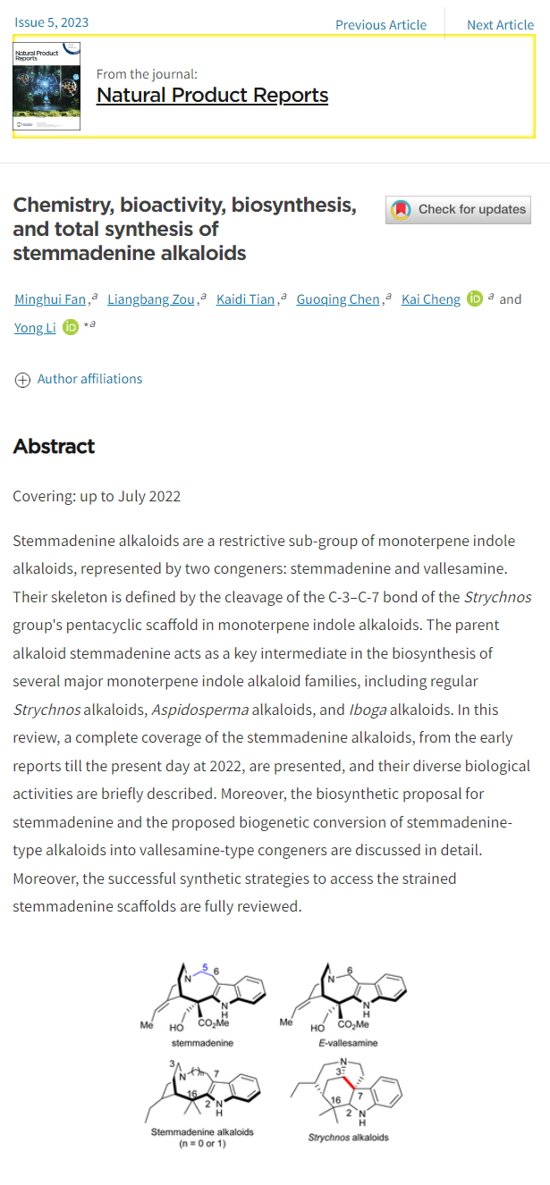近日,化学化工学院浙江省精细化学品传统工艺替代技术研究实验室郦勇课题组在药物化学和天然产物领域国际顶级权威期刊《Natural Product Reports》(《天然产物报告》,药理学、毒理学和药剂学排名第一,IF 15.111)发表了题为“Chemistry, bioactivity, biosesynthesis, and total synthesis of stemmadenine alkaloids (Stemmadenine生物碱的化学结构、生物活性、生物合成及全合成)”的长篇综述文章。郦勇副教授是本论文通讯作者,研究生范明会是第一作者,久久精品一区二区|久久久一区二区三区|欧美日韩视频|欧美福利视频|高清欧美性猛交xxxx黑人猛交|久久久www成人免费精品|在线观看成人网站是唯一完成单位。该工作得到国家自然科学基金(21801167)和浙江省自然科学基金(LQ17B020002)资助。