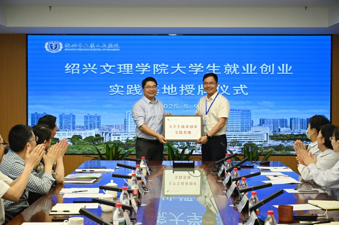 调研团队首先来到校附属上虞医院。医学院副院长、校附属上虞医院党委书记龚月江,校附属上虞医院党委委员、副院长章鲁艇,副院长徐钰祥、党委委员何小平及相关科室负责人对医学院一行来访表示欢迎。座谈会上,双方围绕医学人才培养、实习就业联动和科研项目合作等开展交流。林国旗指出,校附属上虞医院作为绍兴东部地区重要的医疗中心,为学院学生提供了丰富的临床教学资源和实践机会。现场举行了“大学生就业创业实践基地”授牌仪式,此举标志着双方将围绕实习实训、创新创业、就业指导等领域开展深度合作,助力医学生职业能力提升与高质量就业。